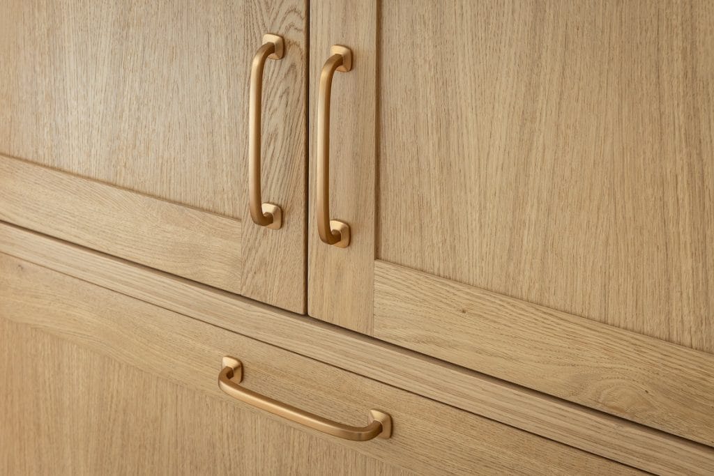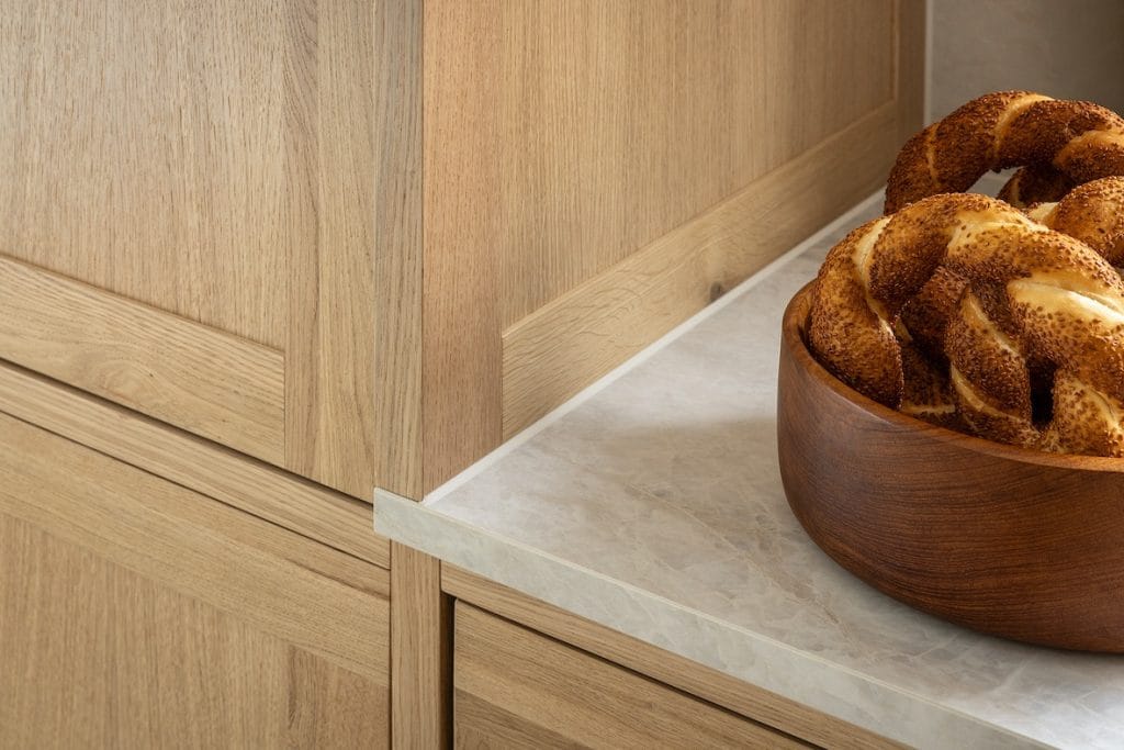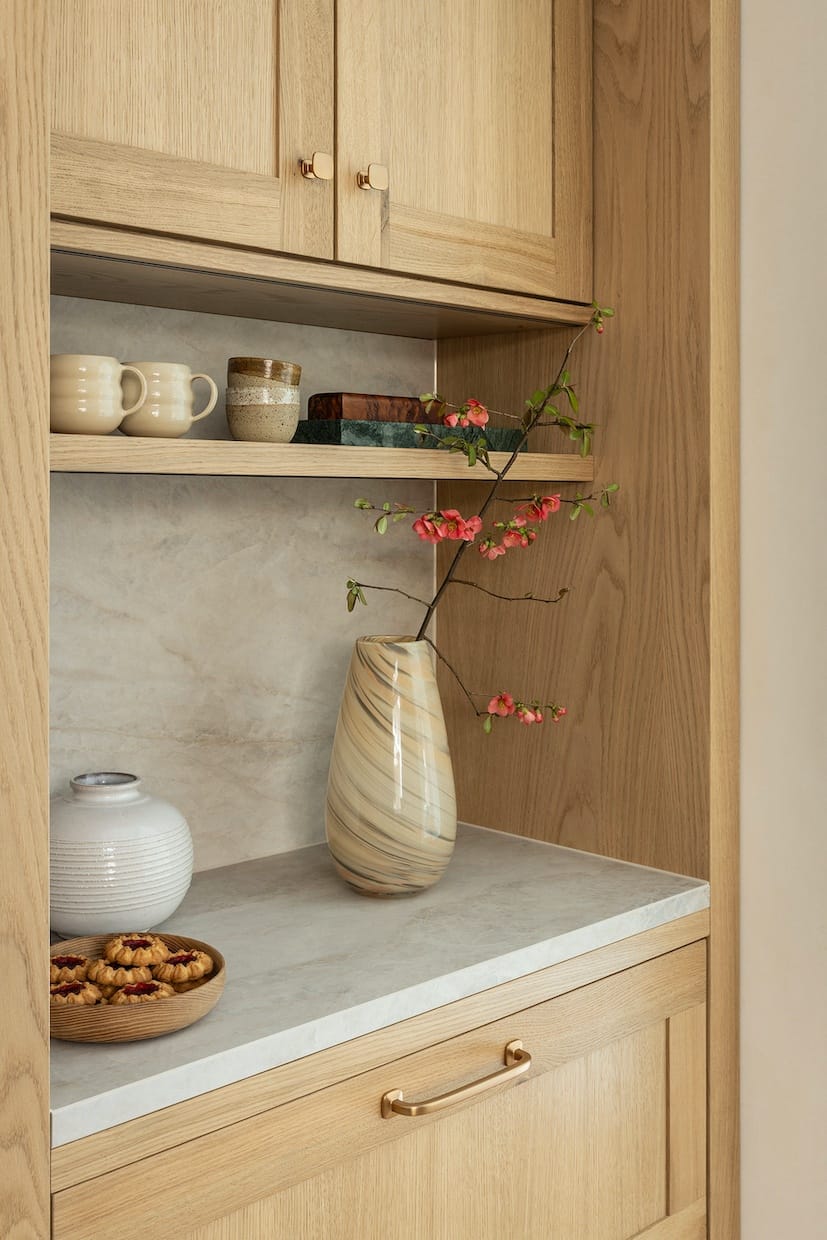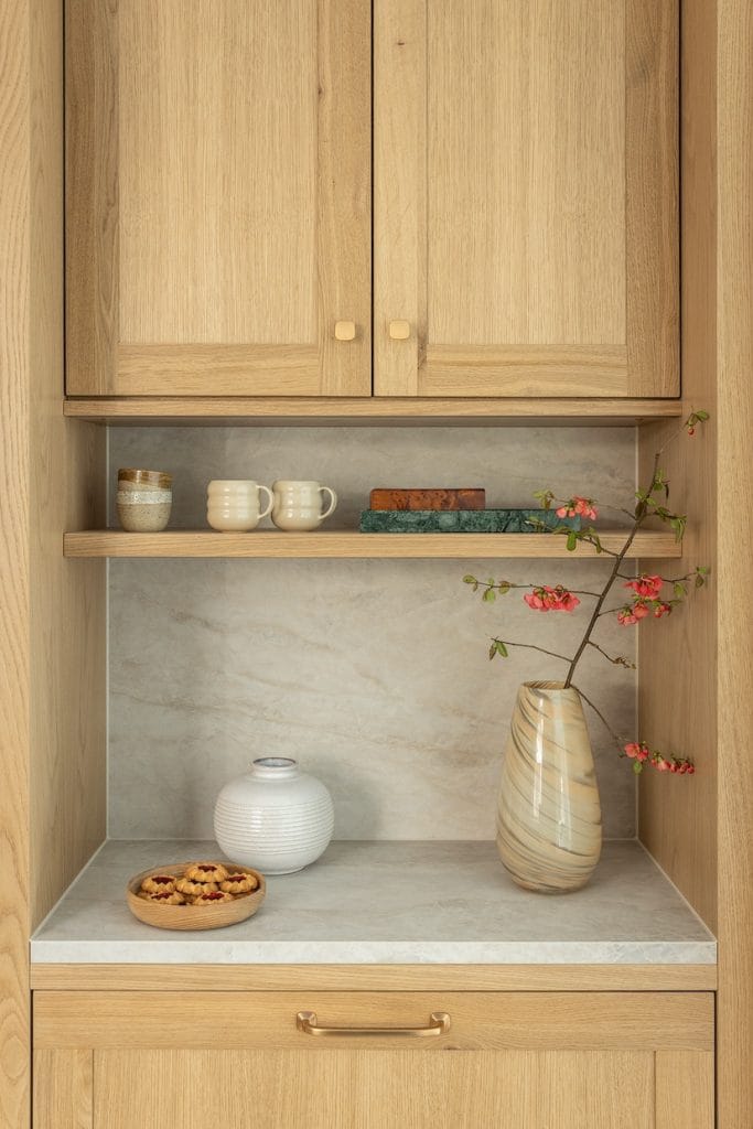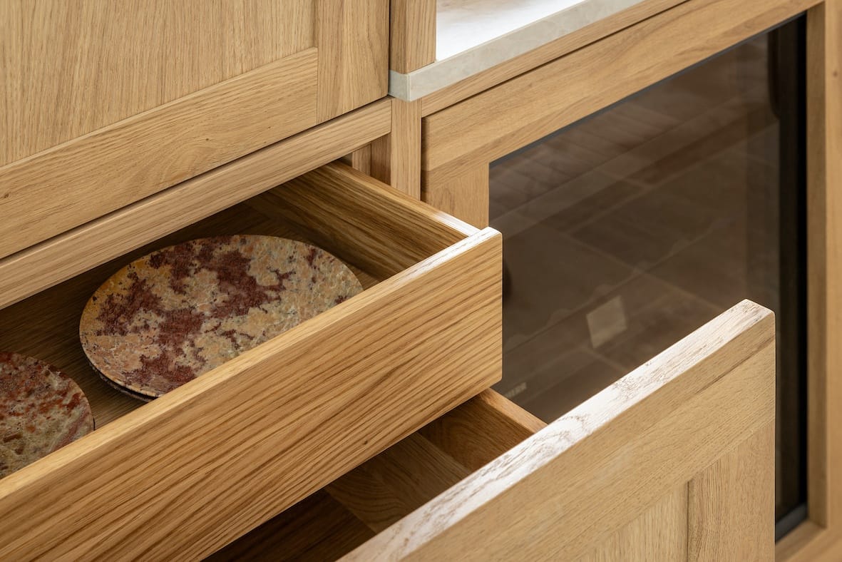 Luxe materialen spelen de hoofdrol. Het warme lichte eikenhout, met zijn rijke nerfstructuur, brengt een natuurlijke zachtheid in de ruimte. Deze combinatie creëert niet alleen een karaktervolle uitstraling, maar ook een harmonieuze sfeer.