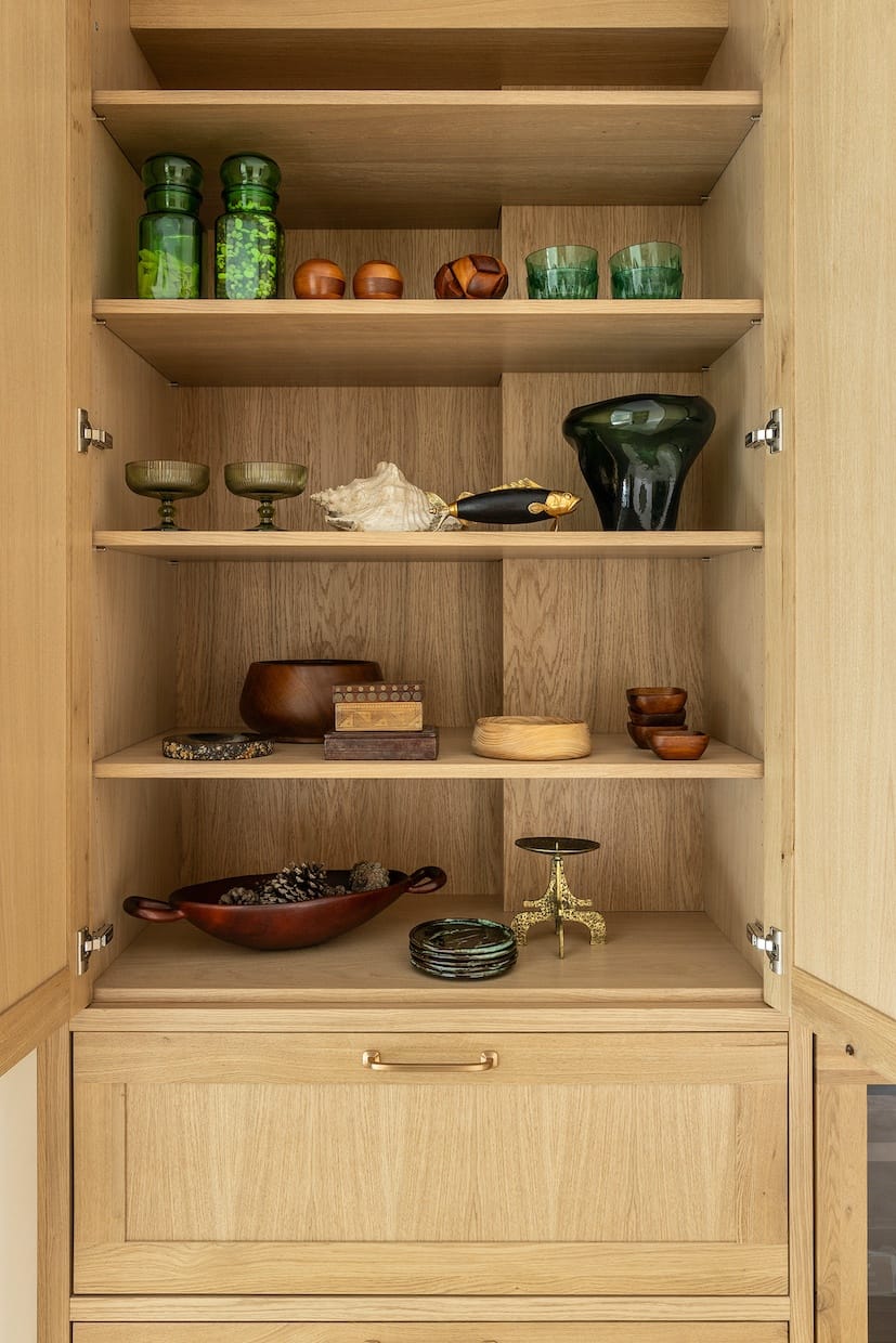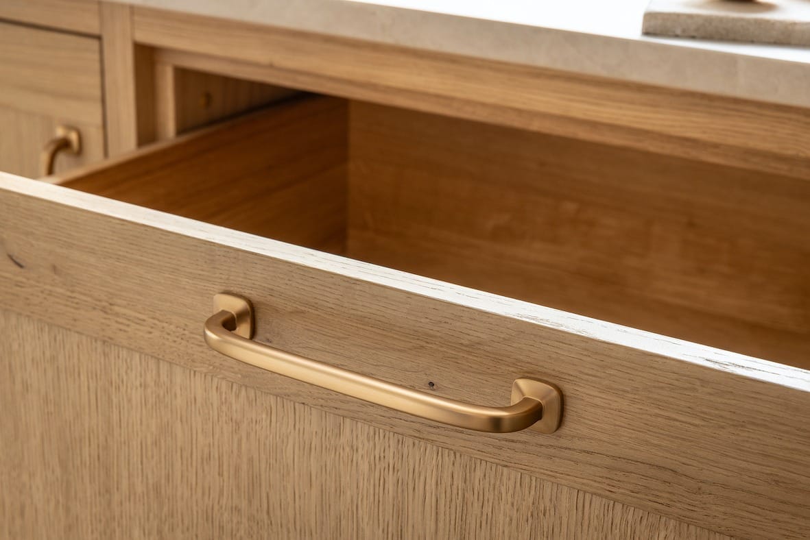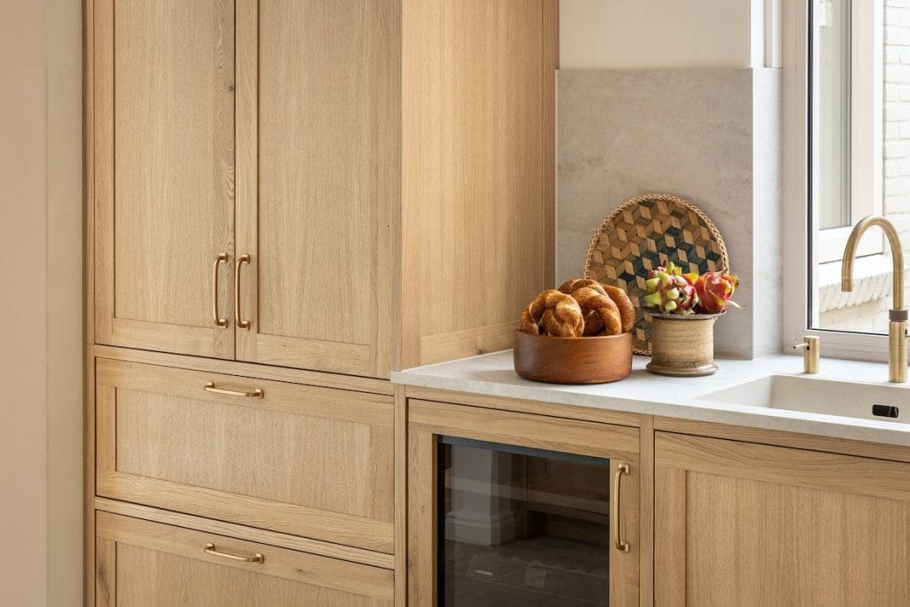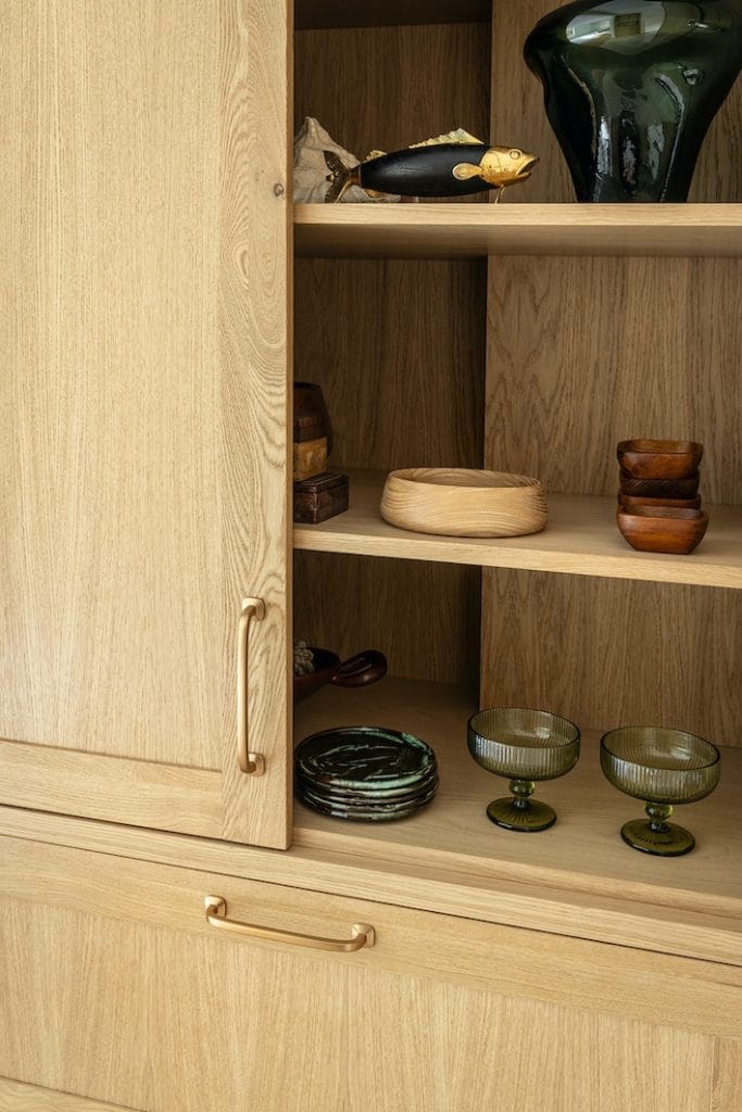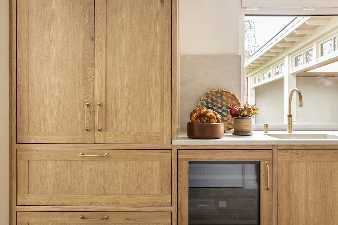 Luxe materialen spelen de hoofdrol. Het warme lichte eikenhout, met zijn rijke nerfstructuur, brengt een natuurlijke zachtheid in de ruimte. Deze combinatie creëert niet alleen een karaktervolle uitstraling, maar ook een harmonieuze sfeer.