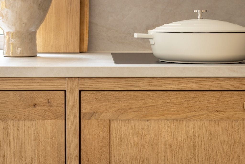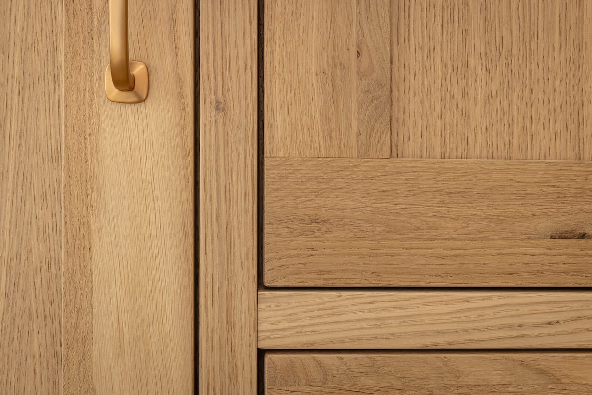 De kleur van eikenhout brengt de natuur in huis. Warme cremekleurig houttinten en toch ook een moderne uitstraling door de strakke afwerking.